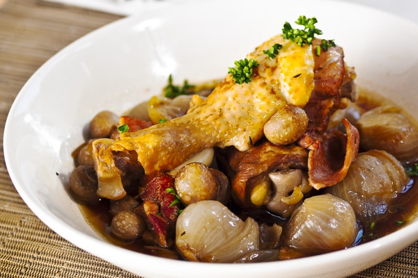 El coq au vin es uno de los platos más conocidos en la gastronomía occitana francesa. Es una especie de estofado de pollo (aunque también puedan usarse otros tipos de carne), con nabos y cebollas, pero cuya característica principal es el vino tinto, del que se echa una buena cantidad. Hay muchos platos típicos franceses pero este tienes que probarlo.